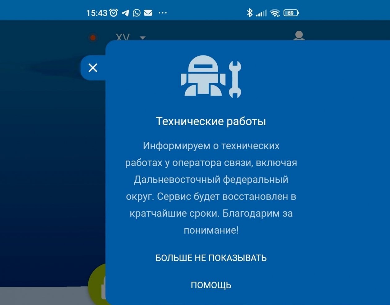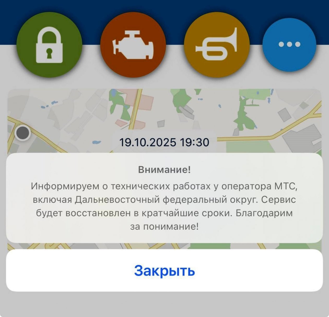 20 октября в мобильном приложении Starline у пользователей появилось сообщение: "Информируем о технических работах у оператора МТС, включая Дальневосточный федеральный округ...". Через несколько минут из сообщения исчезло упоминание МТС.