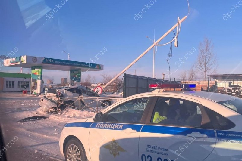В Благовещенске водитель врезался в столб возле АЗС