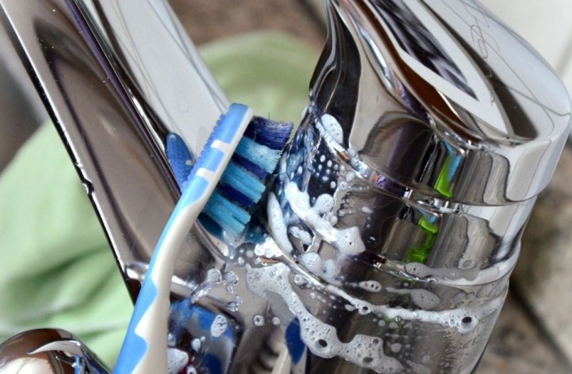 Нанесите пасту на влажную поверхность, оставьте на 20 минут, затем почистите щеткой или губкой и смойте. Сода отлично удаляет мыльный налет и неприятные запахи, дезинфицируя поверхность.