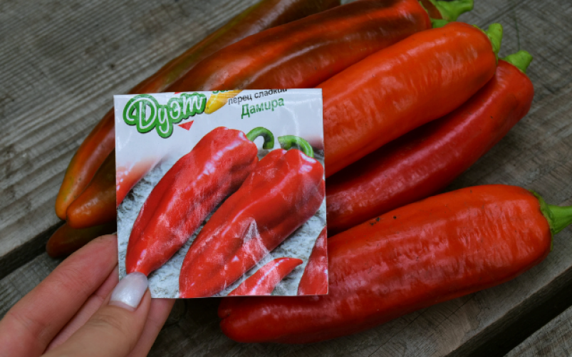 Плоды у "Дамиры" удлинённые, конусовидной формы. Их длина может достигать 18–23 сантиметров, а средний вес составляет 80–140 граммов. По мере созревания перцы меняют цвет с зелёного на насыщенно-красный. Мякоть у плодов сочная и сладкая, с лёгким перечным ароматом. Щедрость "Дамиры" не знает границ — до 7-8 кг с каждого куста.
