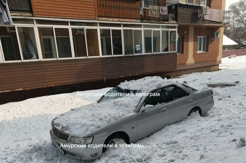 14 марта не повезло автомобилю Nissan — его придавило снегом в районе дома на улице Театральной, 145. О неприятном происшествии сообщает телеграм-канал "Амурские водители" (18+).