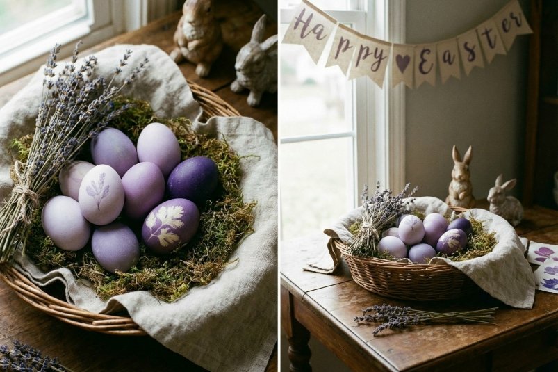 Такие яйца выглядят естественно и благородно. Голубые цвета символизируют чистоту и покой, а фиолетовые — мудрость и внутреннее равновесие.