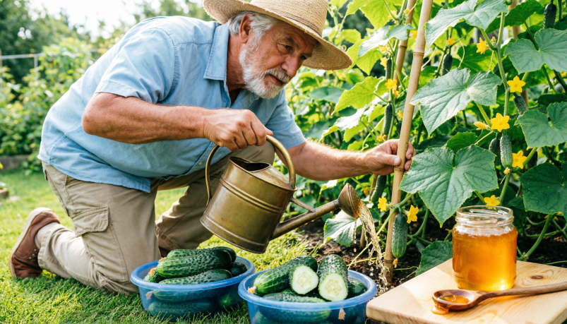 Огородники всё чаще обращаются к проверенным народным рецептам, чтобы спасти урожай от пожелтения листьев и засухи. Как выяснилось, обычный мёд, который годами пылится в кухонном шкафу, способен творить настоящие чудеса на грядках — достаточно добавить всего три ложки при поливе огурцов, и проблема жёлтых и сохнущих листьев уйдет.