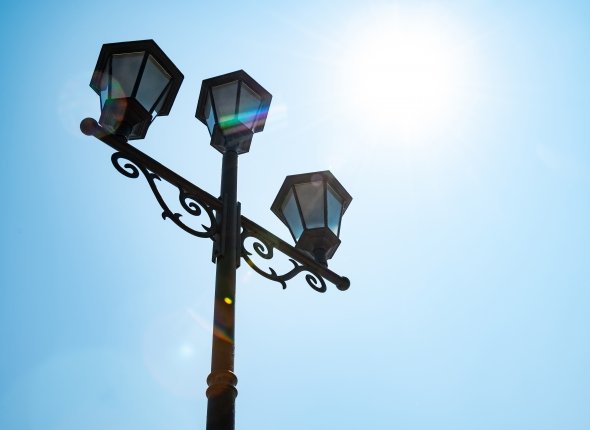 фонари в городе Комсомольск, фонарь днем, солнце, солнечный свет, фонарь на фоне солнца