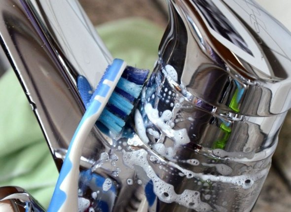 Нанесите пасту на влажную поверхность, оставьте на 20 минут, затем почистите щеткой или губкой и смойте. Сода отлично удаляет мыльный налет и неприятные запахи, дезинфицируя поверхность.