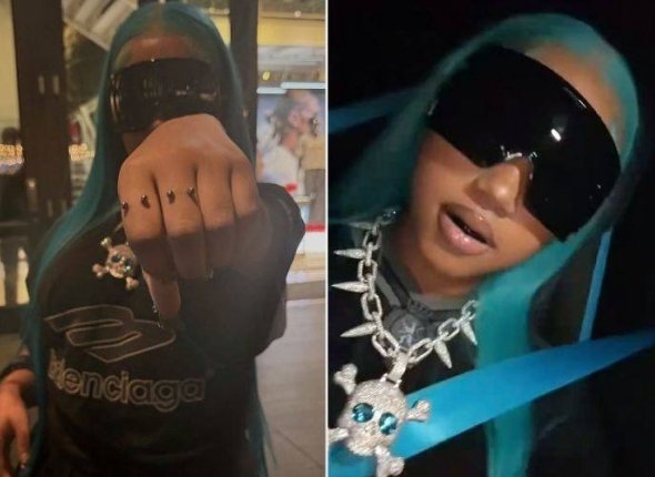 На опубликованных кадрах Норт позирует в голубом парике, полностью чёрном комплекте с футболкой Balenciaga и плиссированной юбкой. Образ дополняет массивная бриллиантовая цепь с черепом от Alex Moss New York. Это рождественский подарок от Ким.