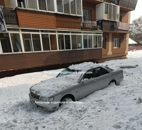 14 марта не повезло автомобилю Nissan — его придавило снегом в районе дома на улице Театральной, 145. О неприятном происшествии сообщает телеграм-канал "Амурские водители" (18+).