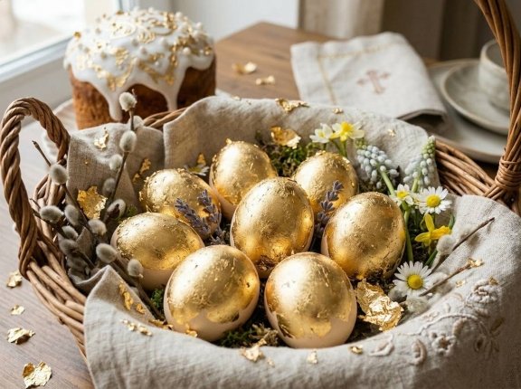 Когда яйца подсохнут, получится эффект драгоценного покрытия, словно их только вынули из сокровищницы. Простая техника создаёт праздничный результат, который выглядит богато и утончённо, при этом остаётся абсолютно безопасным для еды.