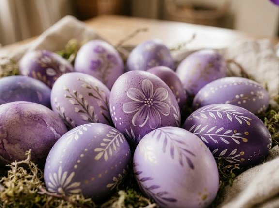 Чтобы результат получился ровным и ярким, стоит брать белые яйца, потому что на них краска ложится лучше. Для блеска скорлупу можно слегка натереть растительным маслом. Если хочется сделать узоры, подойдут листья, трафареты или кусочки кружева. Добавление небольшого количества соды придаёт голубой оттенок, а несколько капель лимонного сока делают цвет мягче и теплее.