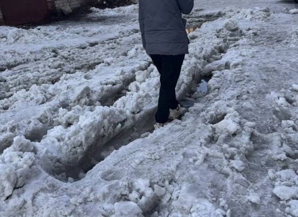 Бьют тревогу из-за снежного хаоса и жители дома на улице Ленина, 101. Пересечь двор — то еще испытание. С верхних дворов и гаражей стекают ручьи, подтапливающие снег, — образуется каша, которая ночью замерзает в ледяную корку с неровностями.